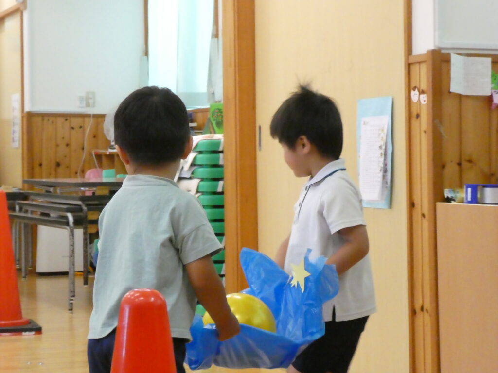 3歳児~5歳児クラスは、天の川にのせて、2人で落とさないように運ぶゲームです♪