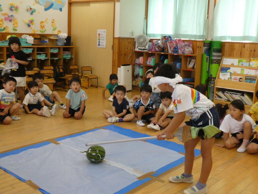 お友達からの「がんばれー!!」と声援を受け、狙いを定めて「えい!」と棒を振り下ろしていました。