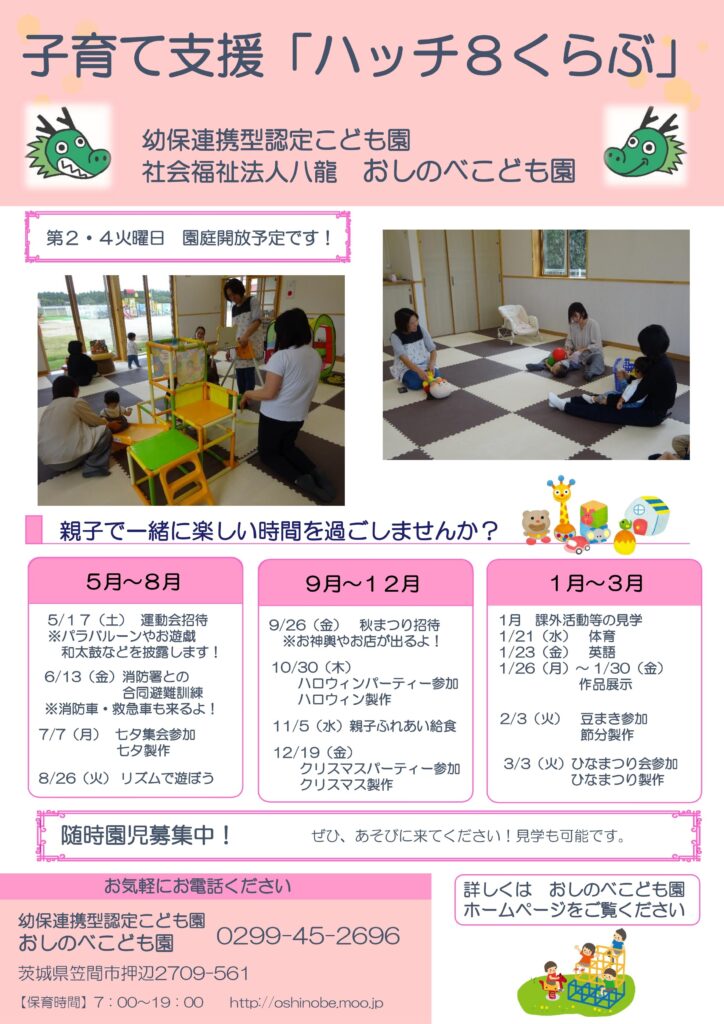 おしのべこども園では、令和7年度 未就学児教室「ハッチ8くらぶ」の参加者を募集しています☆