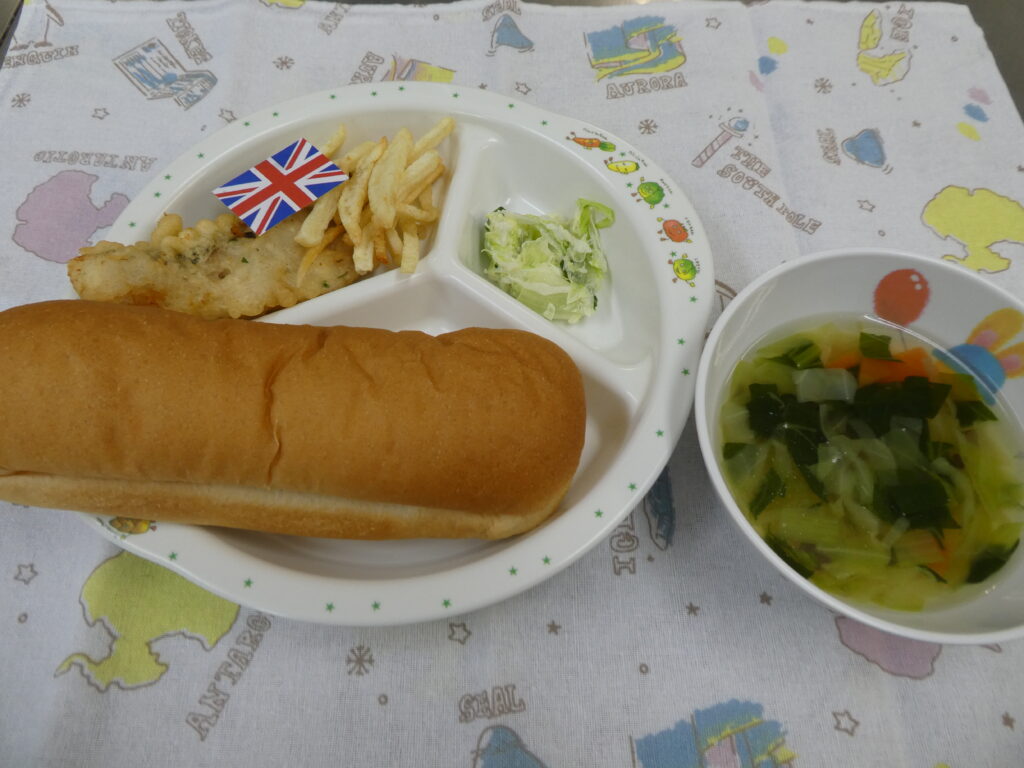 給食は白身魚のフライとフライドポテトを一緒に食べる「フィッシュアンドチップス」🐟🥔