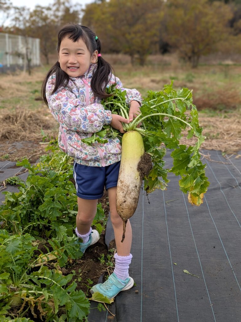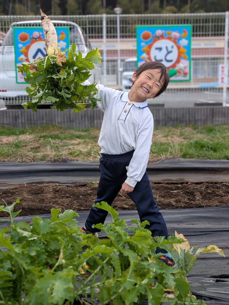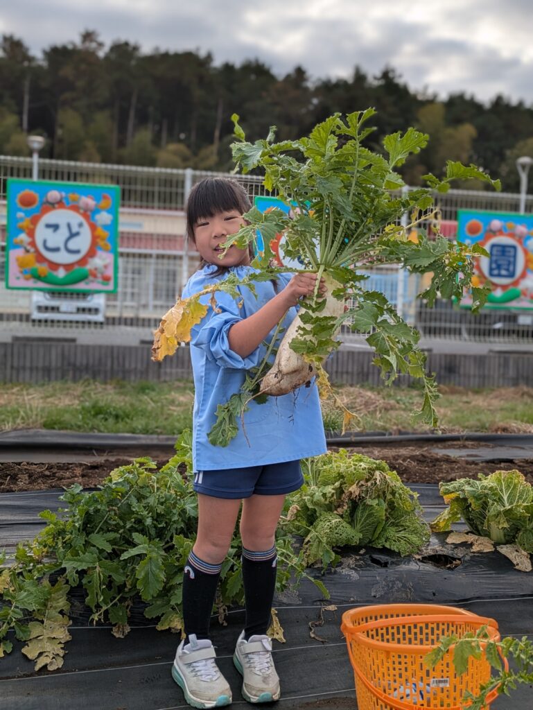 みんなで育てた大根を年長さんに4本収穫してもらいました☆