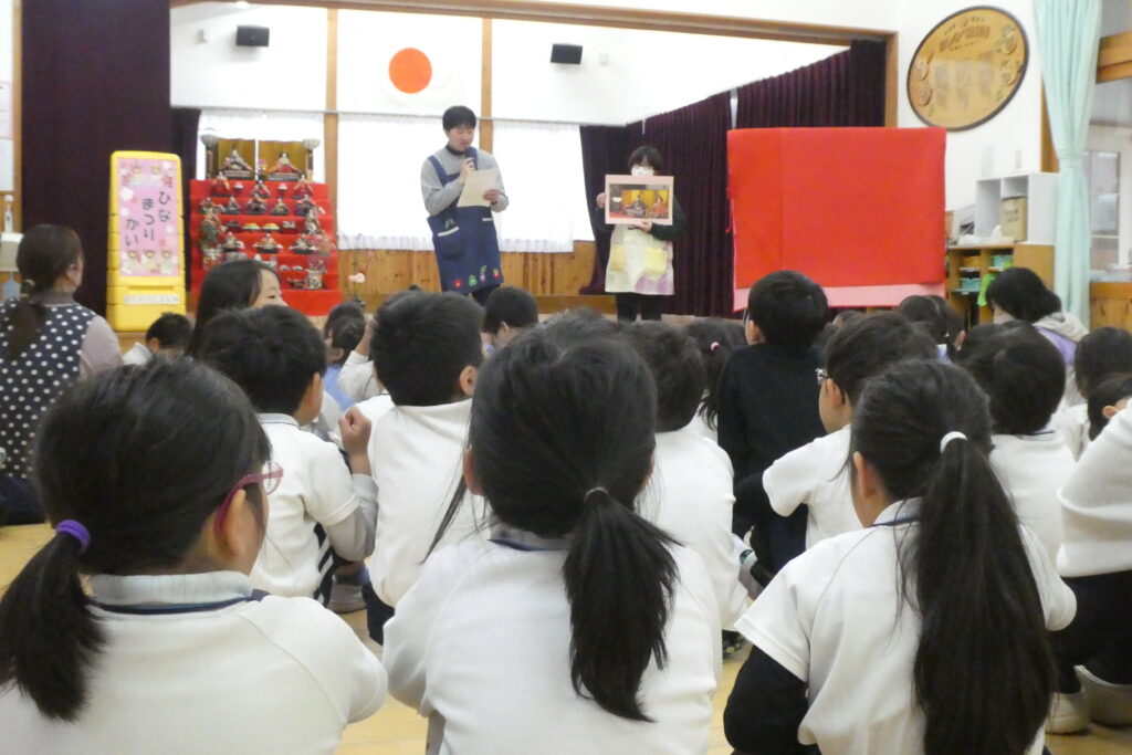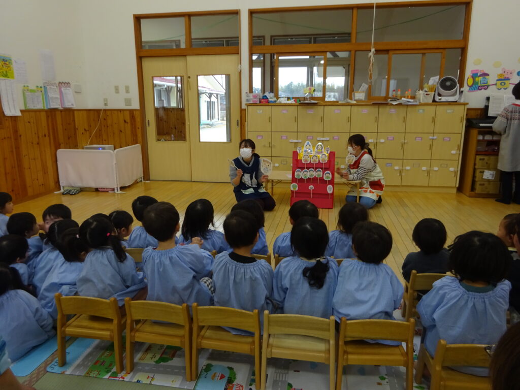 ひな人形がなぜ飾られているのか?の紙芝居をみたり、〇×クイズやゲームに参加したりしました。