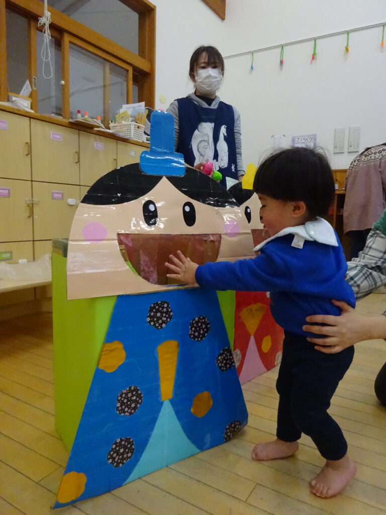 ひなあられをお雛様に食べさせてあげるゲームをしたり・・・