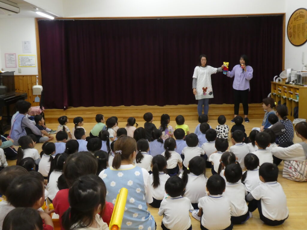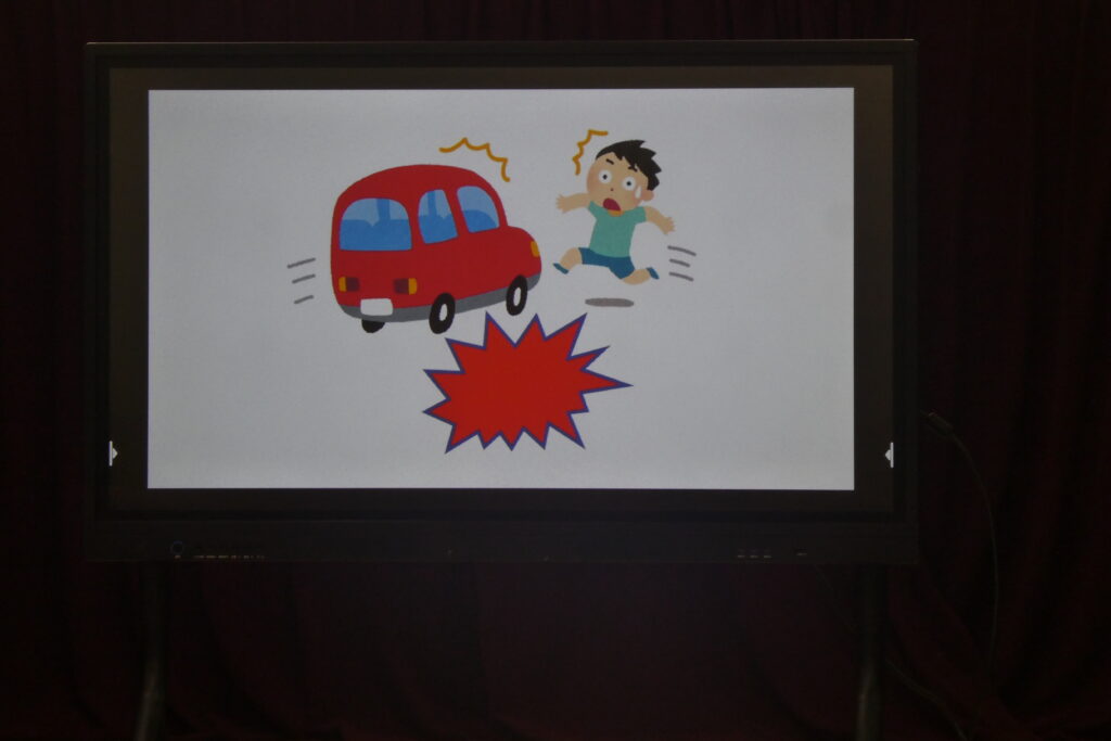 しまじろうのパペットや、飛び出し危険がテーマの映像を使いながら話すと、みんな真剣に聞いていました。