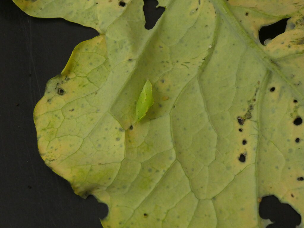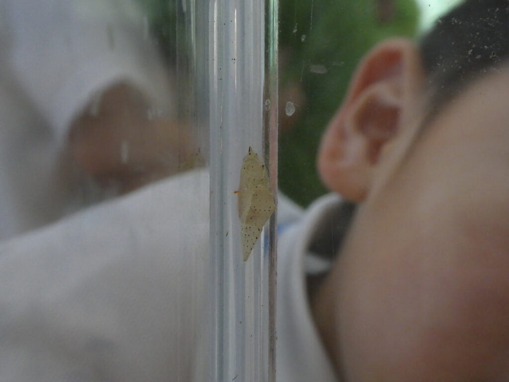 農園からとってきて、子どもたちが飼育していた芋虫がサナギになって・・・