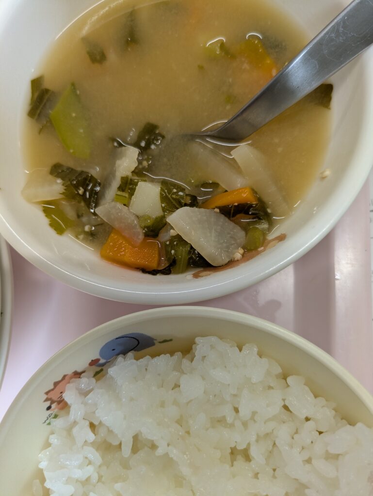 今日の給食も、みんなが育てた大根、スナップ、カブ、ネギの「野菜たくさん味噌汁」おいしかったですね!