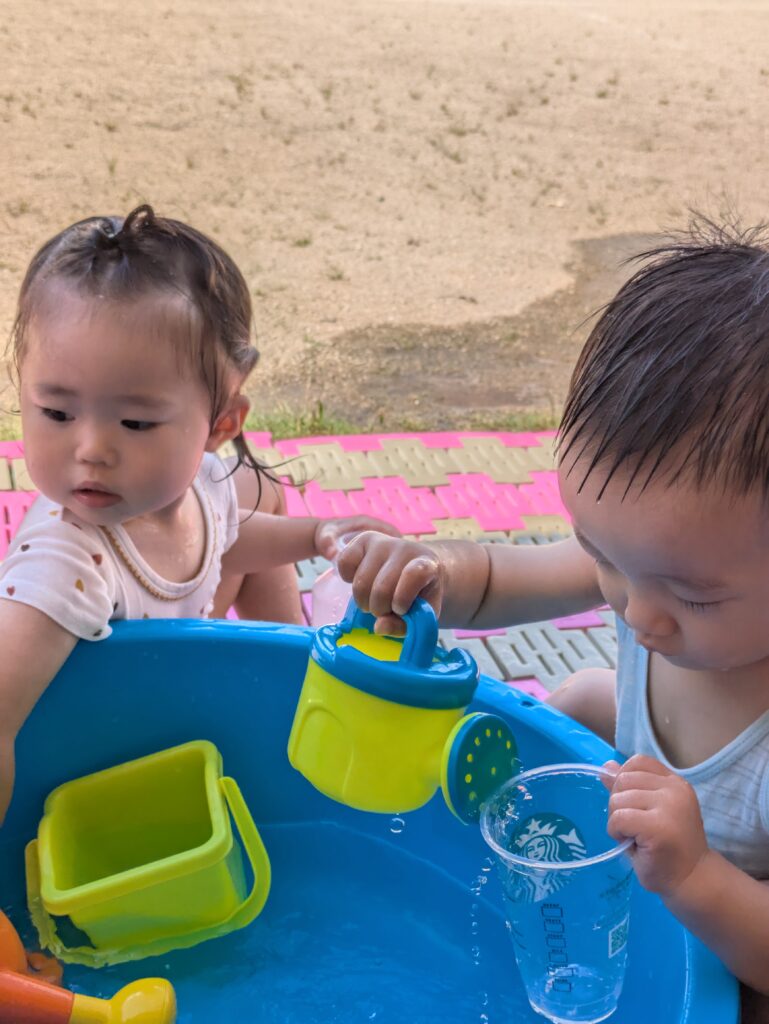 未満児のお友達は、たらいに入った水をじょうろやカップで水を出し入れしたり、手でバシャバシャと水しぶきをあげたりしながら、水の感触や冷たさを味わいながら、水遊びを楽しんでいます🤽