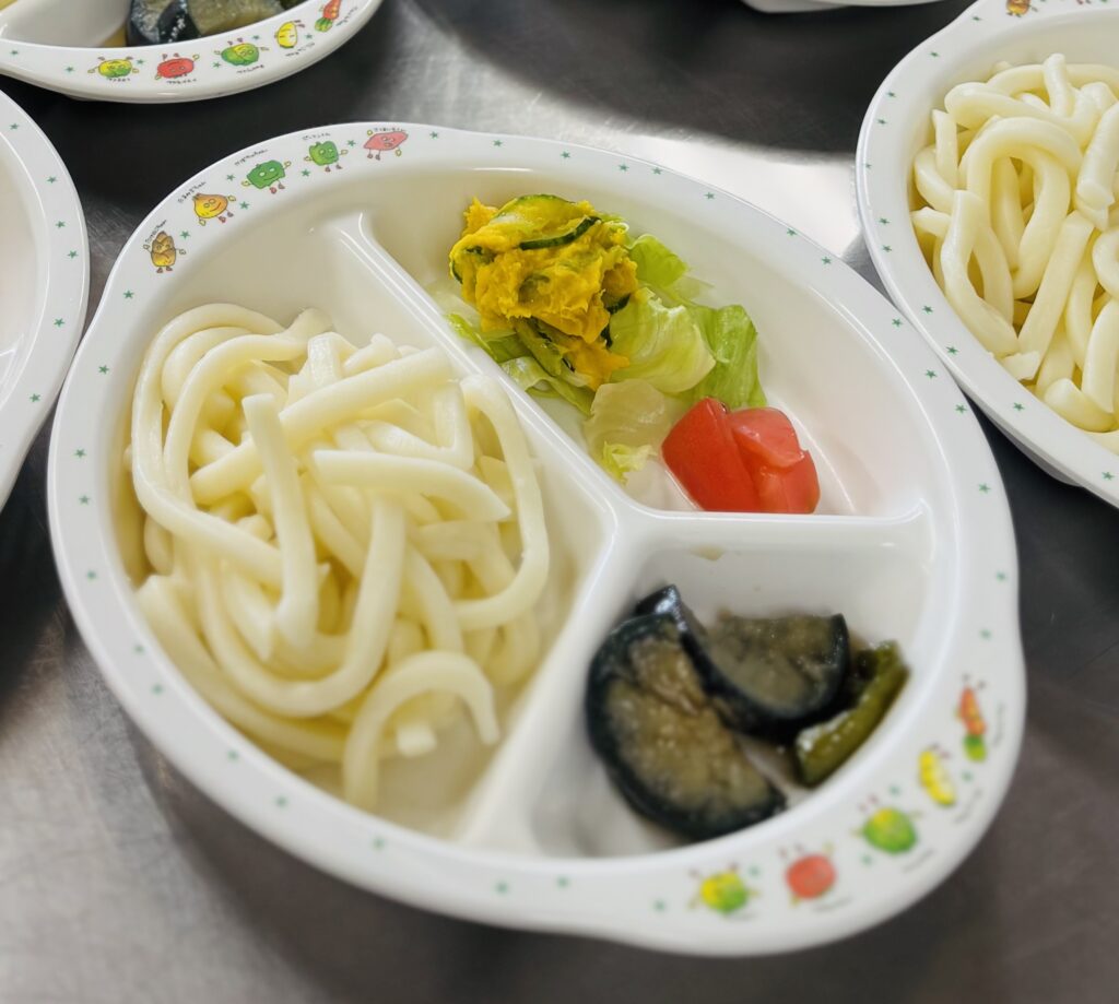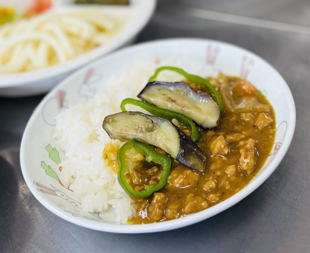 カレーライスの他にも、モロヘイヤとナスを使ったうどんの出汁にカボチャのサラダ、ナスとピーマンの煮びたしと色鮮やかで素敵なメニューになりました♪