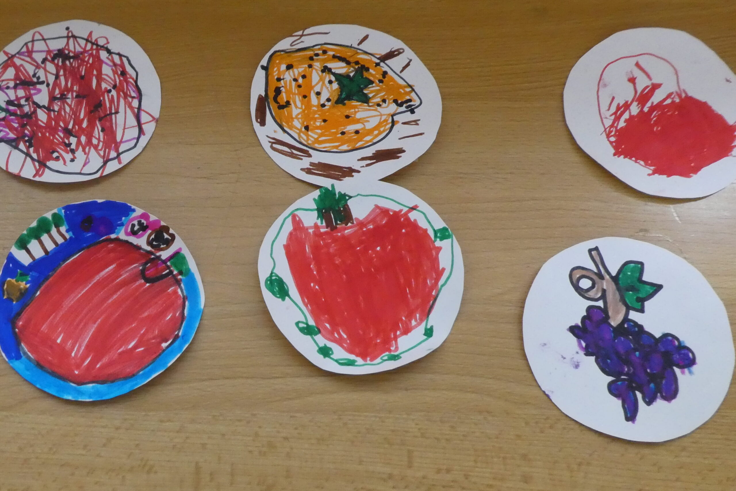 リンゴ、ミカン、ぶどうの3つの中から好きな果物を選んで、マーカーペンで色を塗ります🖍️