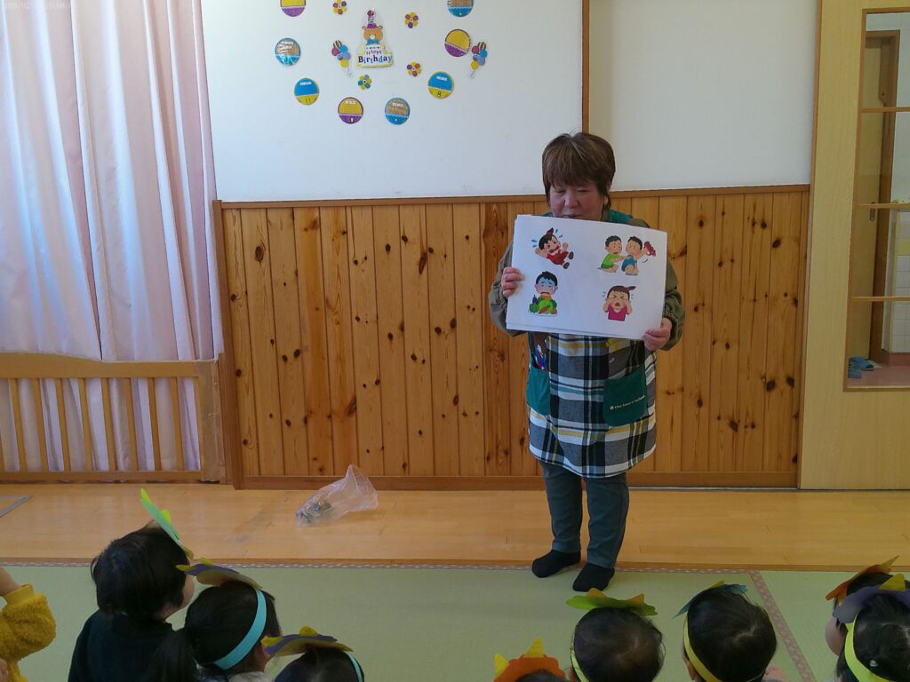 園のお友達と一緒に節分についてのお話を聞いたり、「豆まき」の歌を歌ったり、