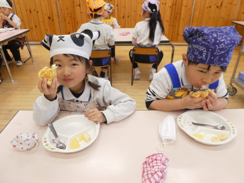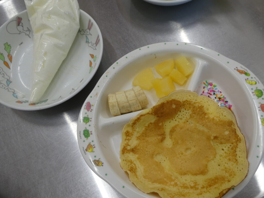 生地はホットケーキミックスを使って、一枚一枚、給食室で焼き上げました💕