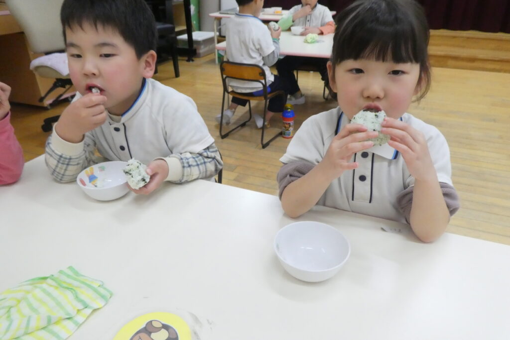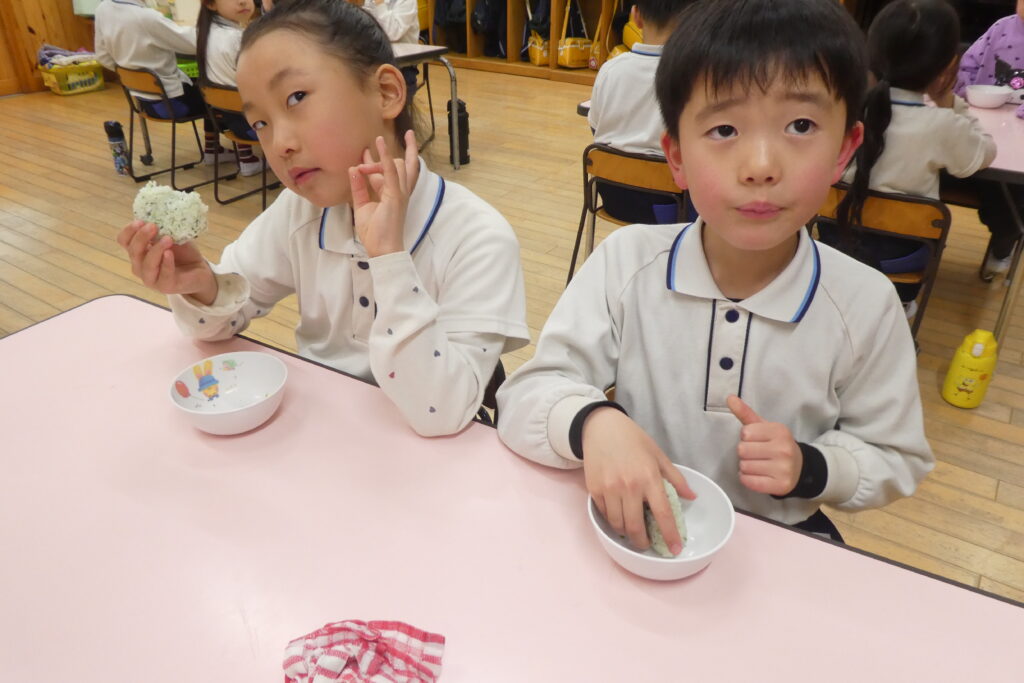 今日のおやつは・・・採れたてのお野菜をたっぷり使った、「若菜おにぎり」です🍙💕